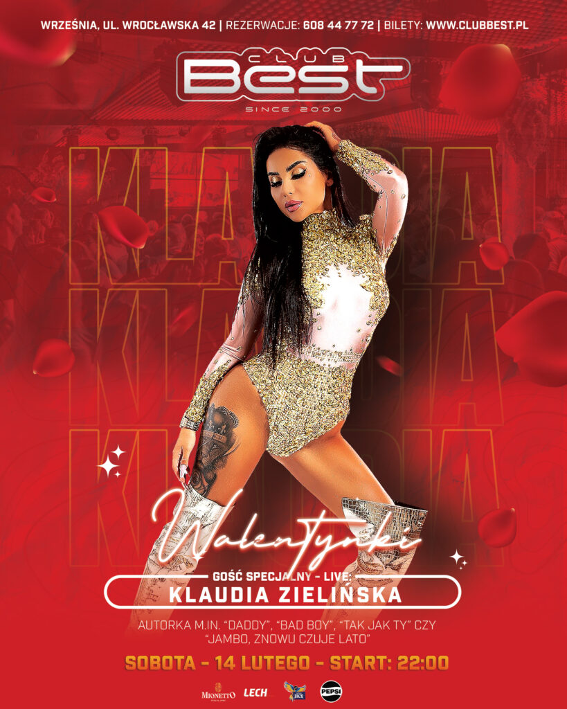 Miłość wisząca w powietrzu, dobre koktajle, doskonała atmosfera, najlepsza ekipa #teamBest oraz koncert Klaudii Zielińskiej, autorki wielu tanecznych przebojów, w tym m.in. „Bad Boy”, „Tak jak Ty” czy „Daddy” – tak wygląda najlepszy plan na walentynkową noc na parkiecie!