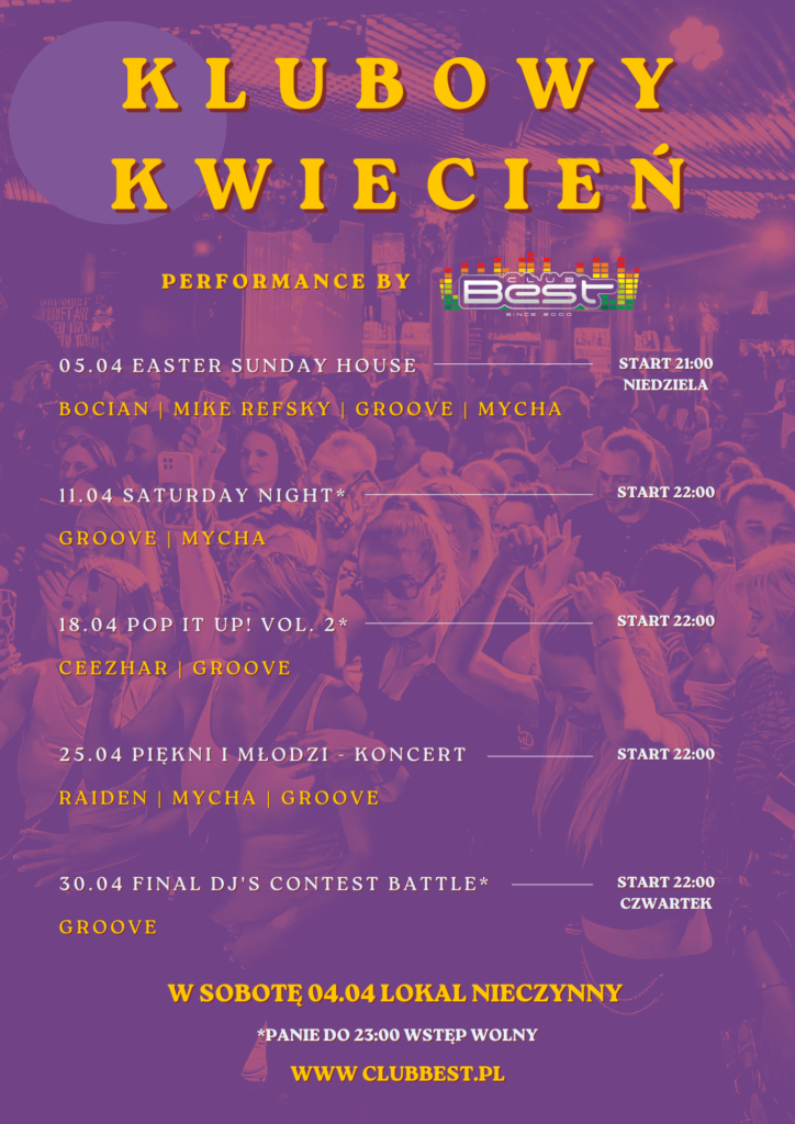 Tym razem przy Wrocławskiej 42 imprezę rozkręcać będą Piękni i Młodzi! Największe taneczny hity, które przez ostatnie lata rozkręcały niejeden parkiet, będziecie mogli usłyszeć w wykonaniu na żywo już 25 kwietnia. Dodatkowo zapraszamy oczywiście na imprezę taneczną, którą poprowadzą dla Was Raiden, Mycha oraz Groove na naszych dwóch salach.